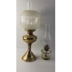 Two oil lamps the smaller Wee Willie Winkie style approx 38cm tall, glass based and the larger one glass and brass 57cm high
