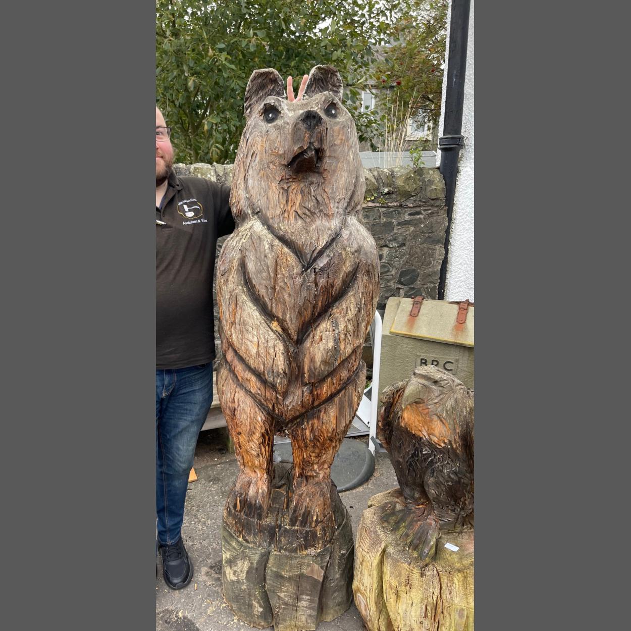 A 6ft plus tall forest hand carved from a tree stump standing brown BEAR - ‘I'm 6 years old and want a new home' - I cost £1900 when new!