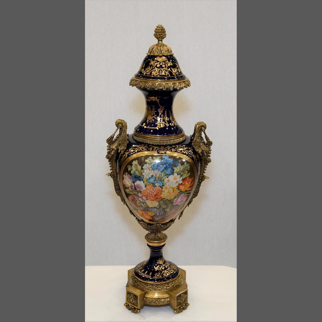 A hand made Chinese porcelain trophy vase with high grade painting and gold detailed finish. Origin Shantou Circa 1990 Condition Good One Temple jar only in this lot.. H: 84cm W: 27cm D: 21cm