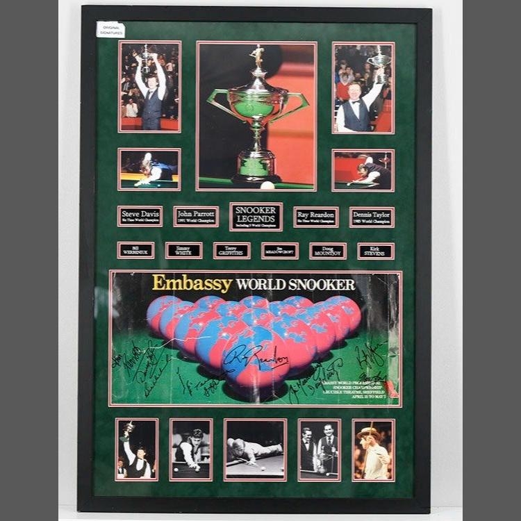 This framed presentation is signed by many of the snooker greats from the 2001 World Championships. Including STEVE DAVIS, JIMMY WHITE, JOHN PARROTT and many more. All signed on original 2001 championship poster. Previously folded (see photos of list) This original presentation will be accompanied with a certificate of authenticity (free of Charge). H: 126cm W: 88cm D: 3cm