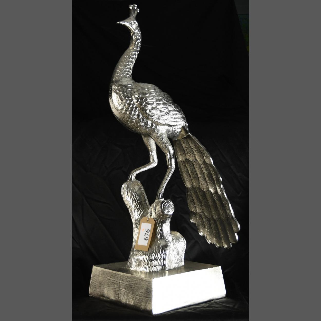 A very large highly polished aluminium Peacock on base. A wonderfully unusual piece with good detail.. H: 100cm W: 49cm D: 33cm