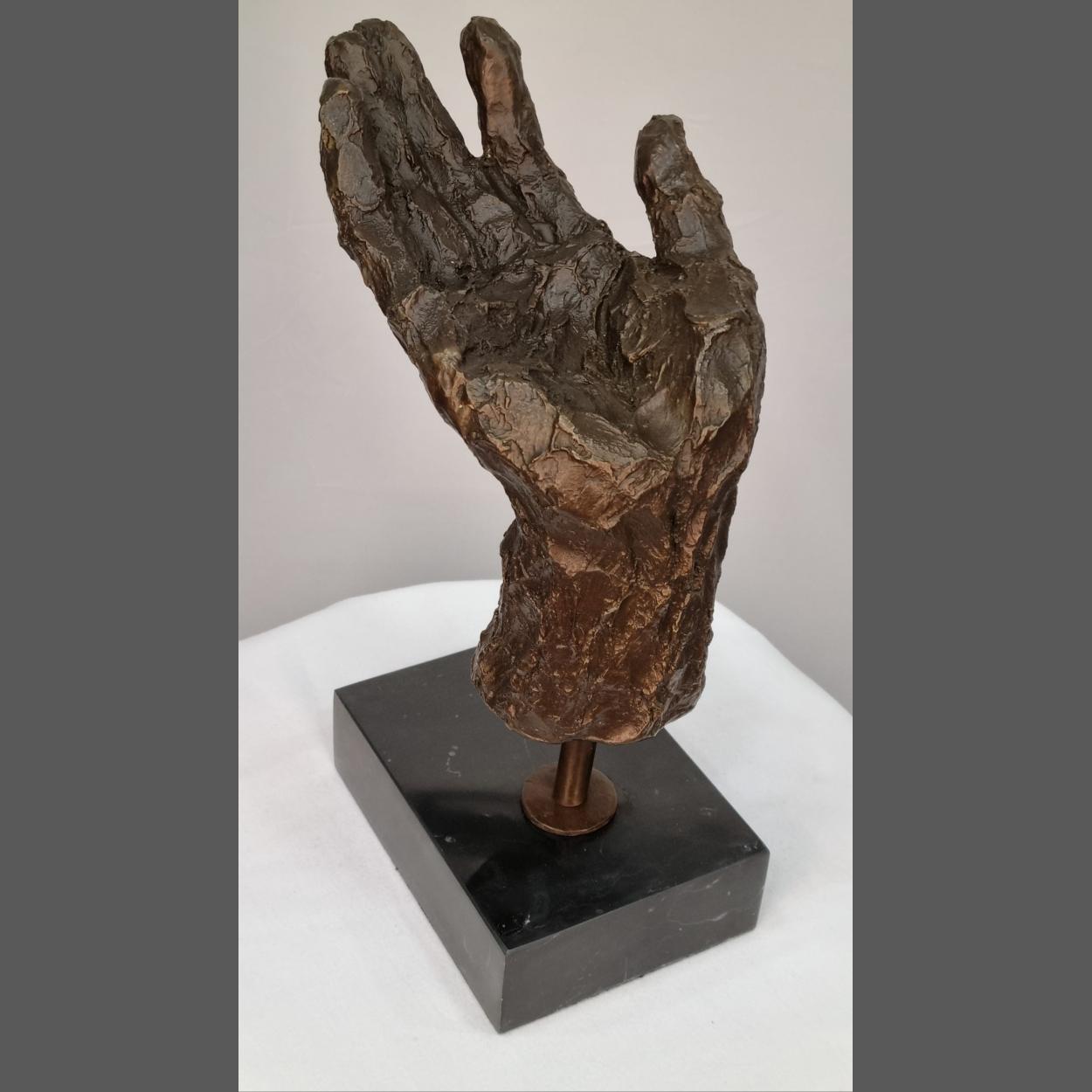 A bronze casting of a hand with well sculpted rough detail finish set in a solid marble base. H: 27cm W: 12cm D: 22cm