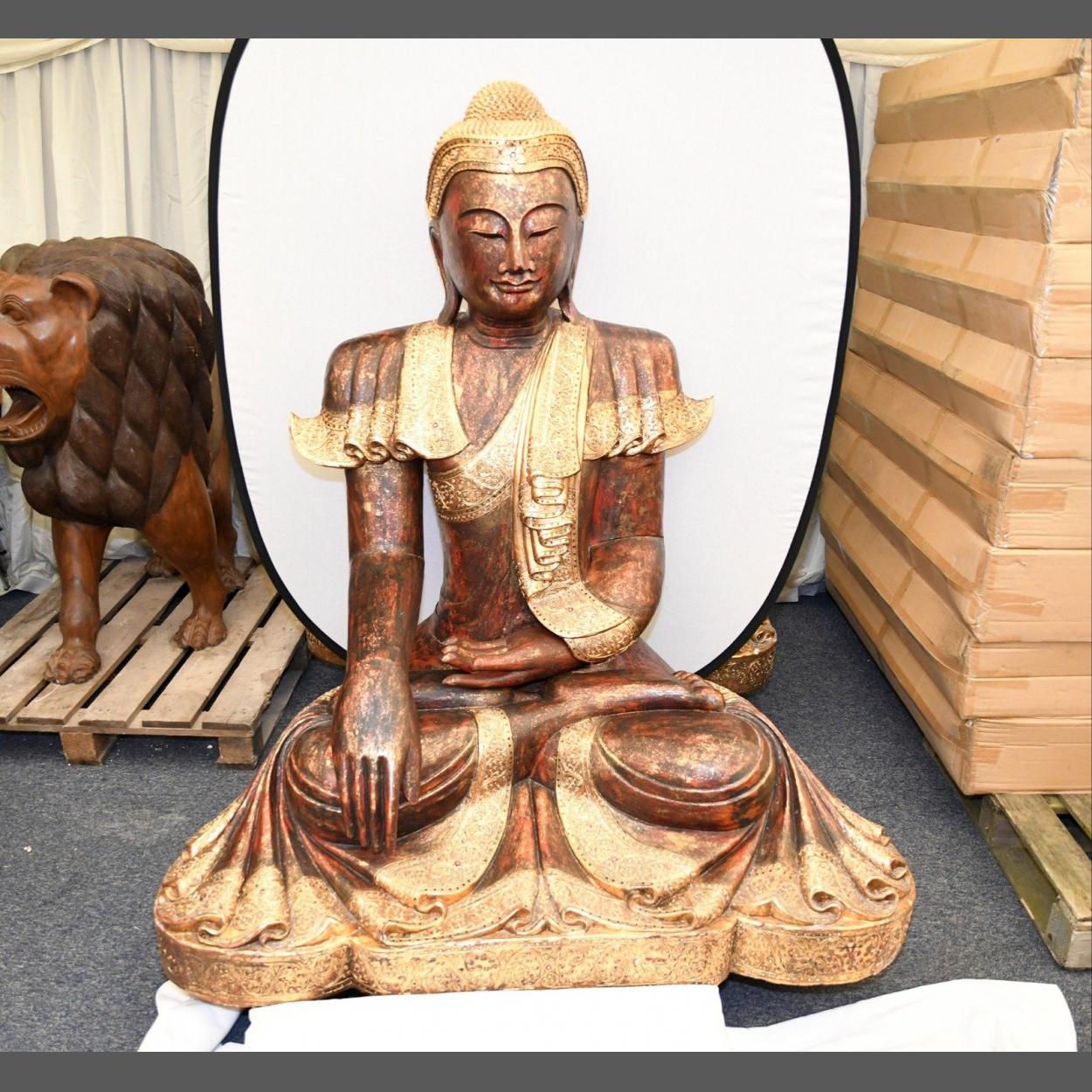 A unique wooden hand made very large sitting Buddha with gold colour decoration standing approximately 5ft high and 5ft wide. Origin Burma. Circa 1980s Condition very good. H: 155cm W: 148cm D: 100cm