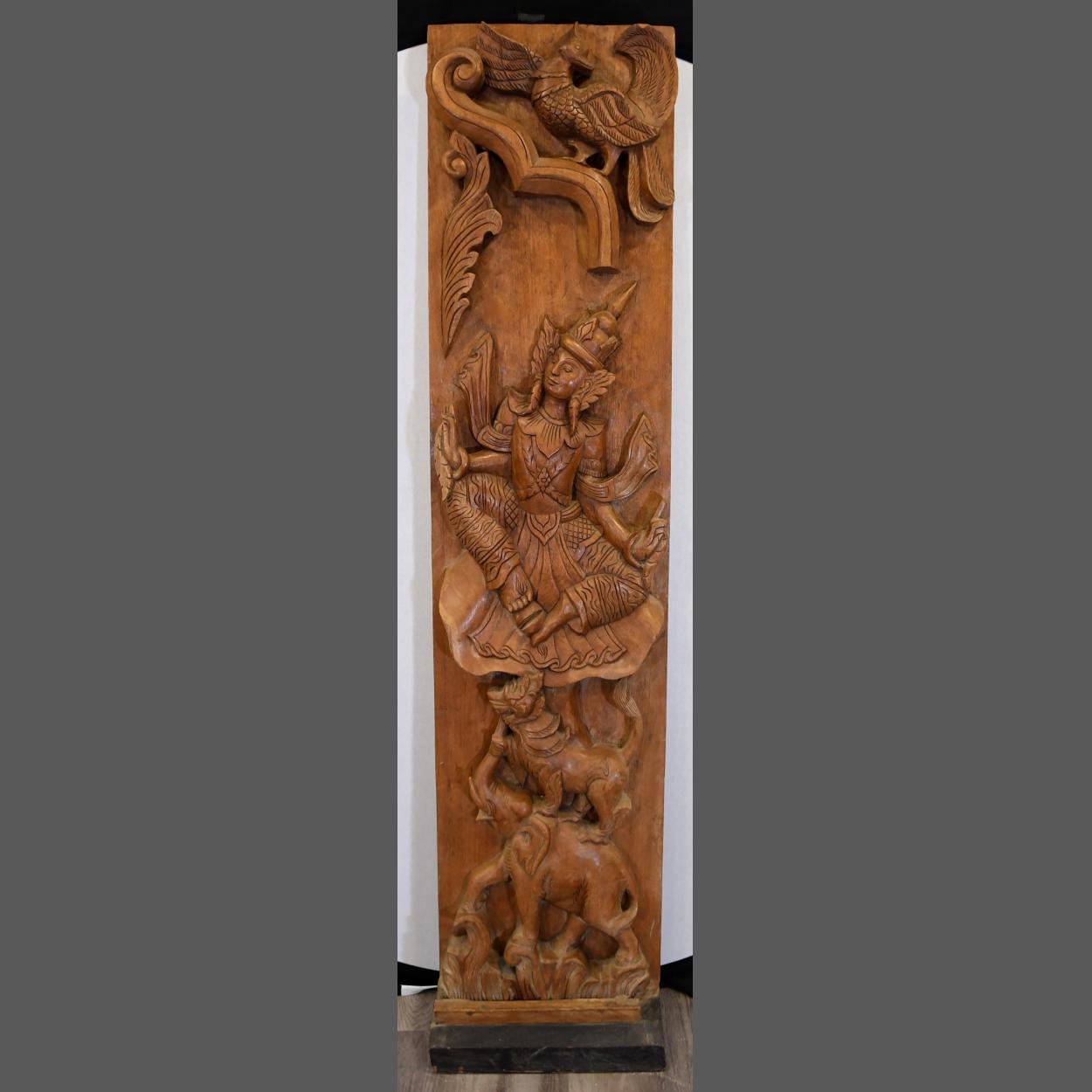 An original hand carved large teak wood panel depicting a goddess with animals Origin Thailand Circa 1990 Condition Good. H: 193cm W: 45cm D: 23cm