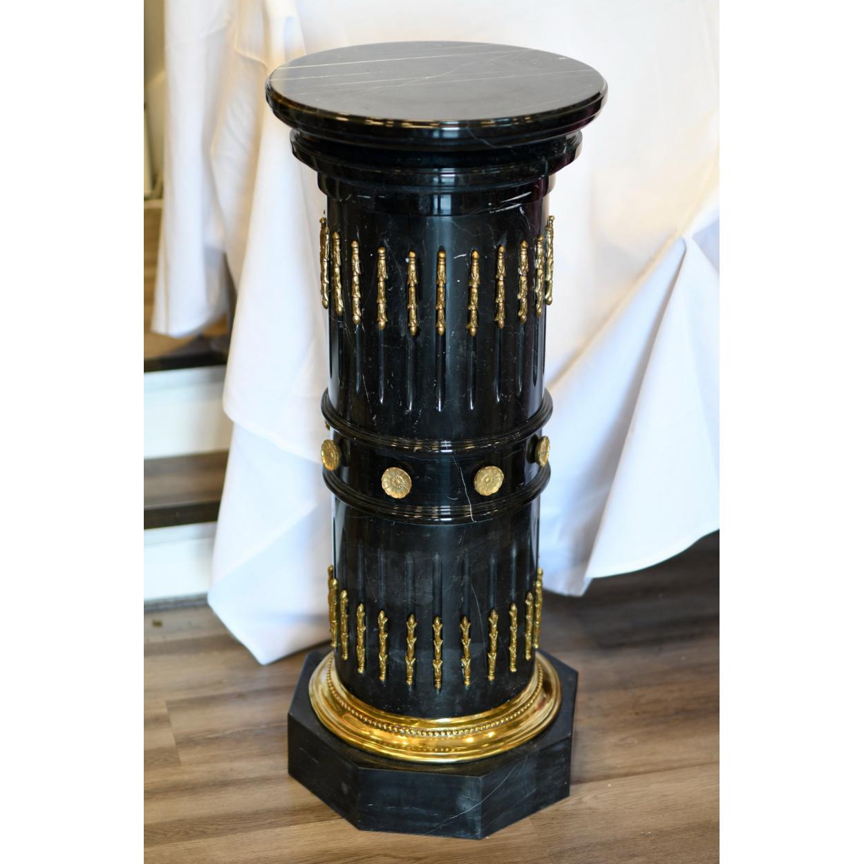 A solid black marble plinth with brass detail fittings. Very highly polished and in excellent condition. Very heavy piece due to the solid marble. Origin Dalian.. H: 101cm W: 43cm D: 43cm