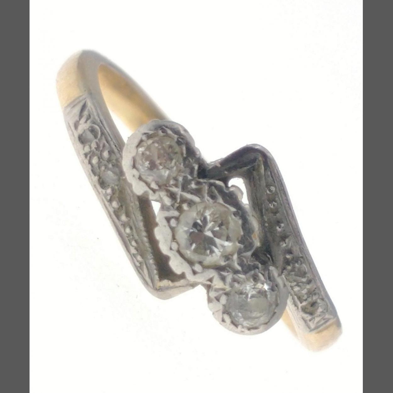 An 18ct yellow gold ring with three centre diamonds. Size O, gross weight 3.47g approx. Centre stone 3mm and flanked by two 2mm stones approx and all three stones appear clean and bright