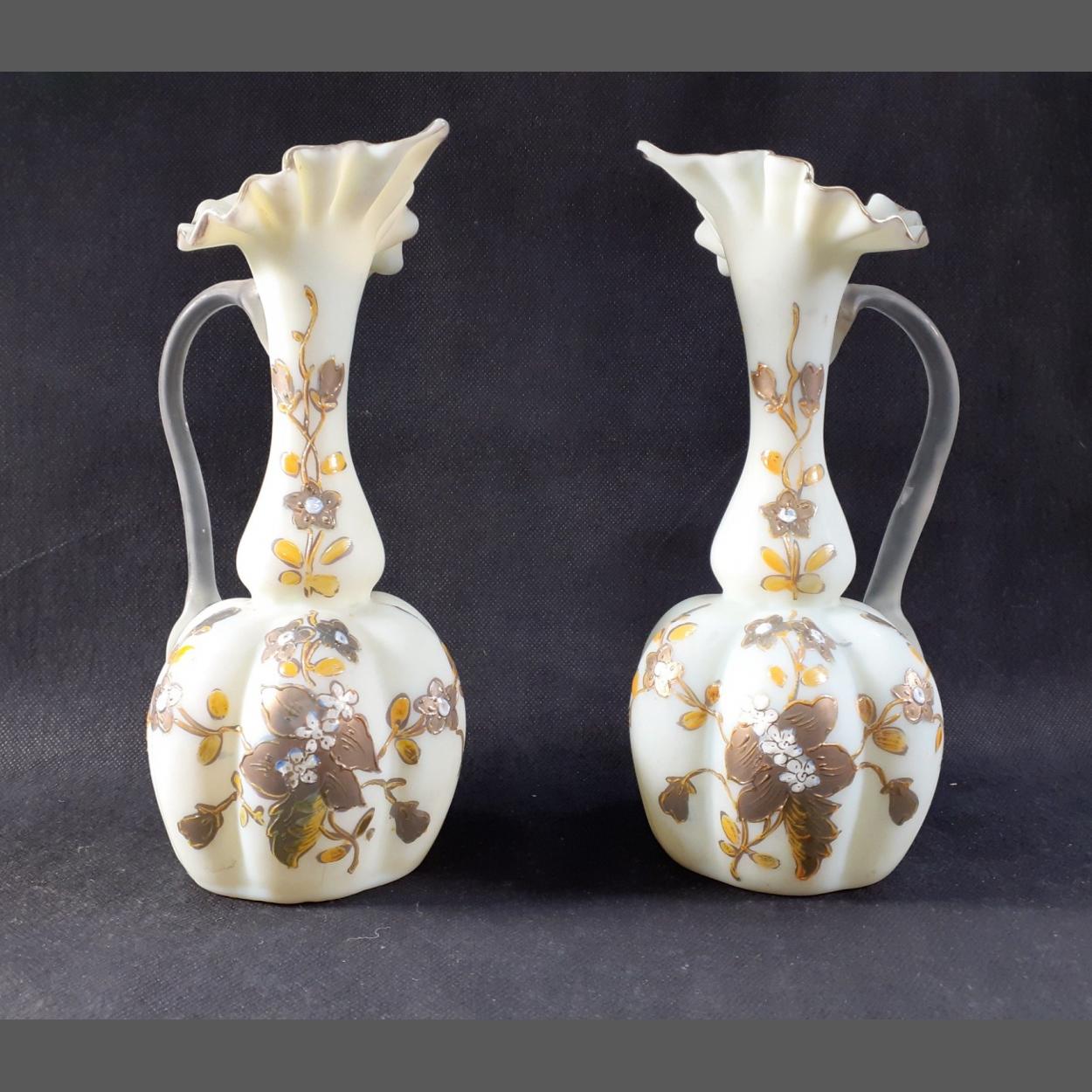 A pair of antique milk glass hand made decorated vases each standing 22cm tall. One with an older repair to handle.