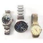 A tin of old watches including Sekonda, Lorus, Timex etc plus a vintage Russian SLAVA clock, face 6cm dia