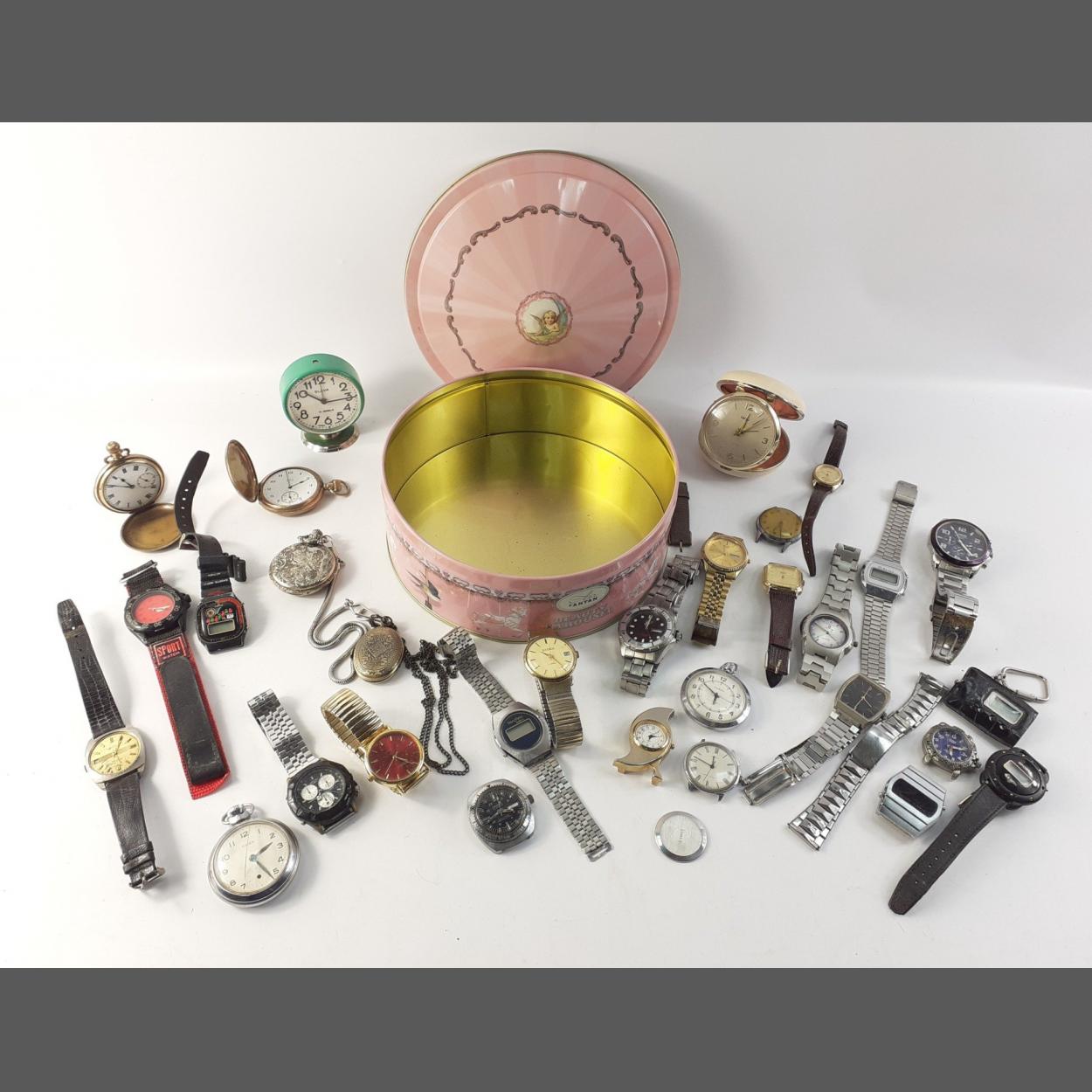 A tin of old watches including Sekonda, Lorus, Timex etc plus a vintage Russian SLAVA clock, face 6cm dia