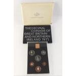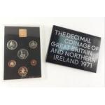 A small album of foreign currency banknotes of interest and a cased 1972 decimal coin set in envelope.