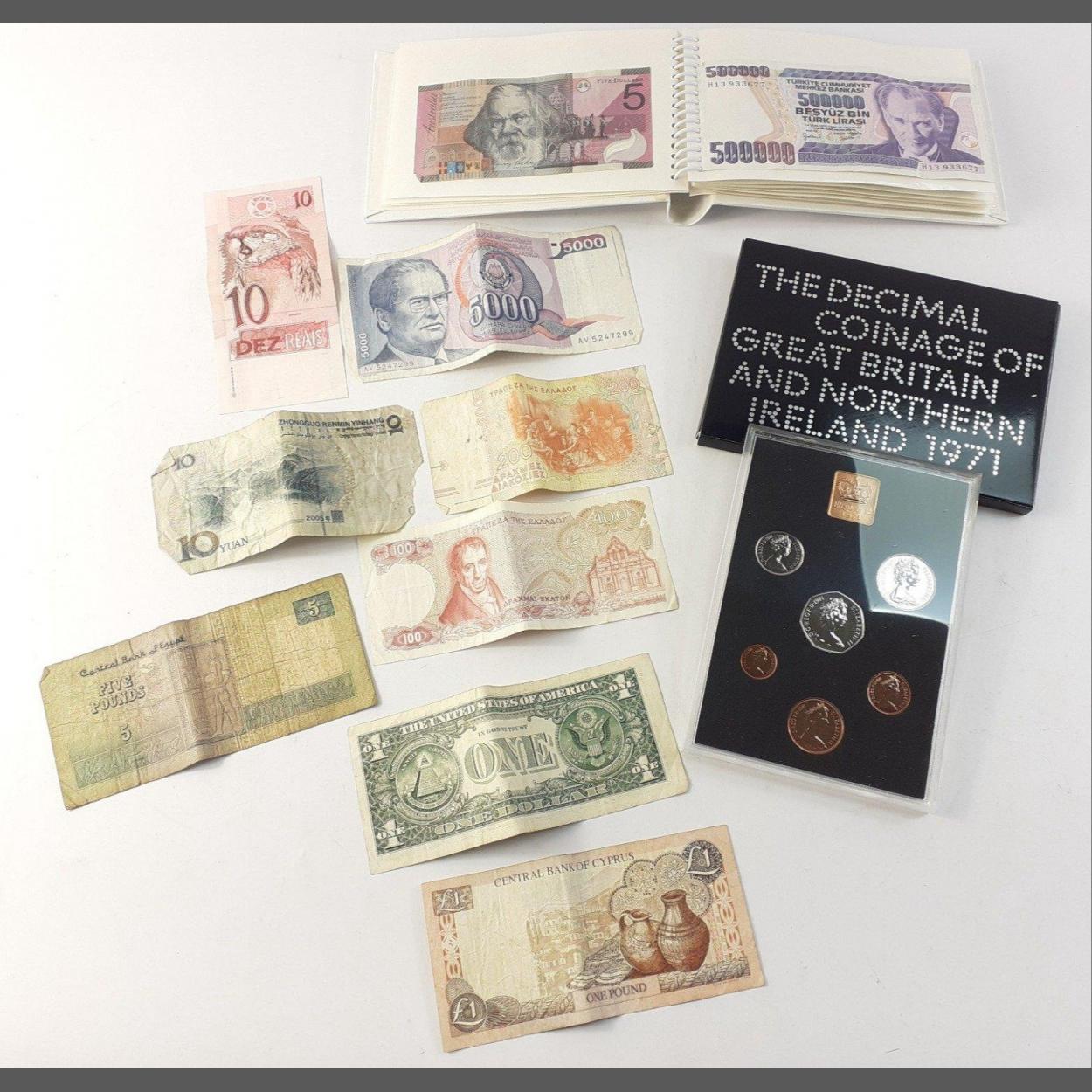 A small album of foreign currency banknotes of interest and a cased 1972 decimal coin set in envelope.