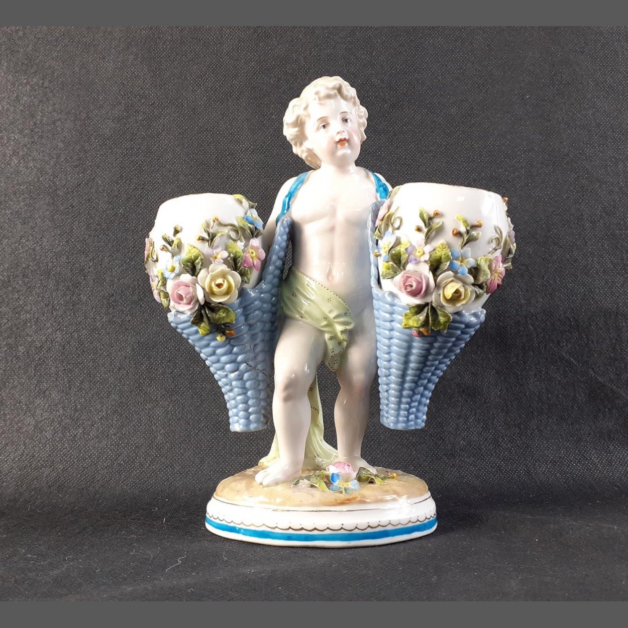 A rather beautiful Dresden style cherub figure spill vase in excellent condition. 20cm high approx. No chips, cracks or repairs.