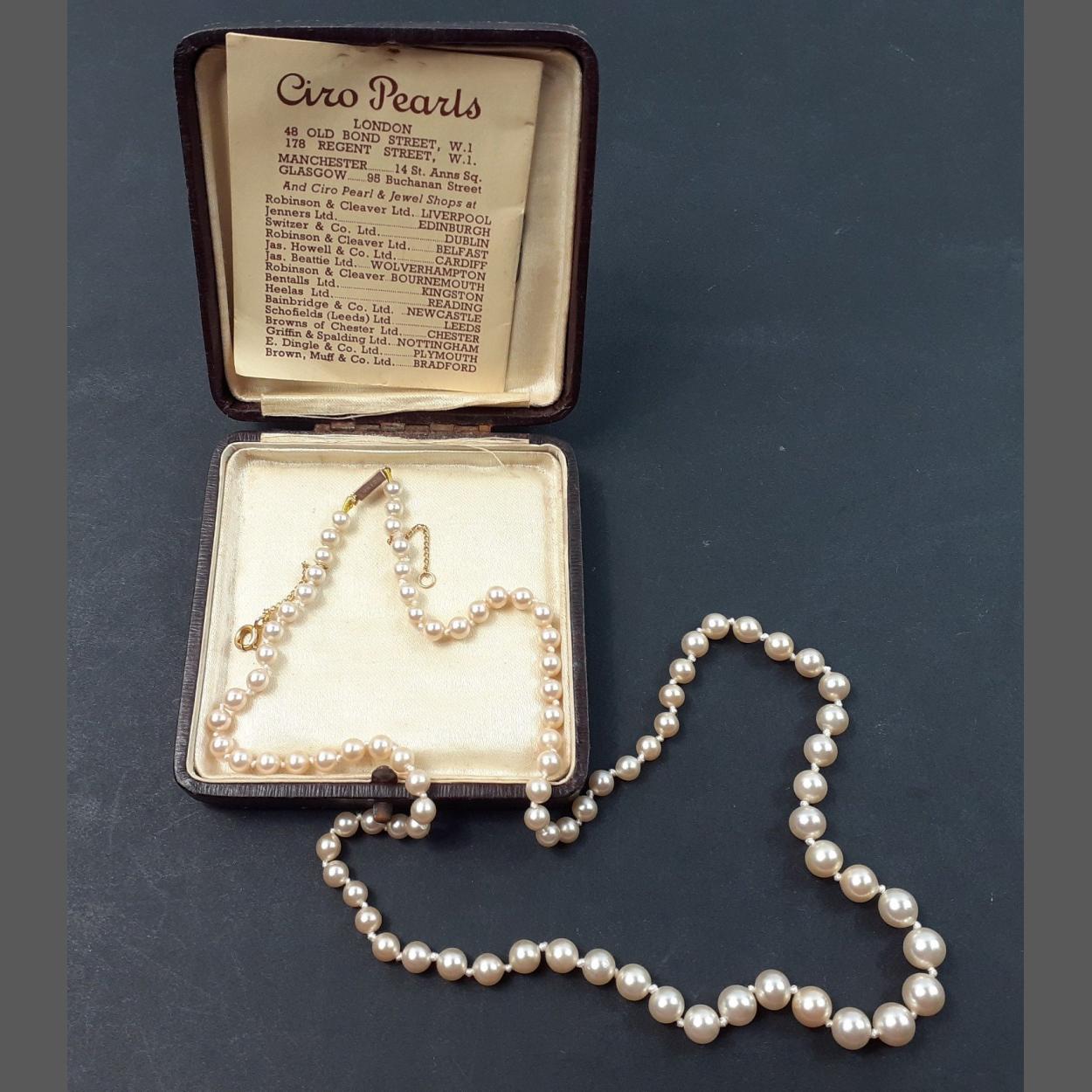 A boxed string of CIRO pearls with catch stamped 9ct, safety catch, approx 50cm long