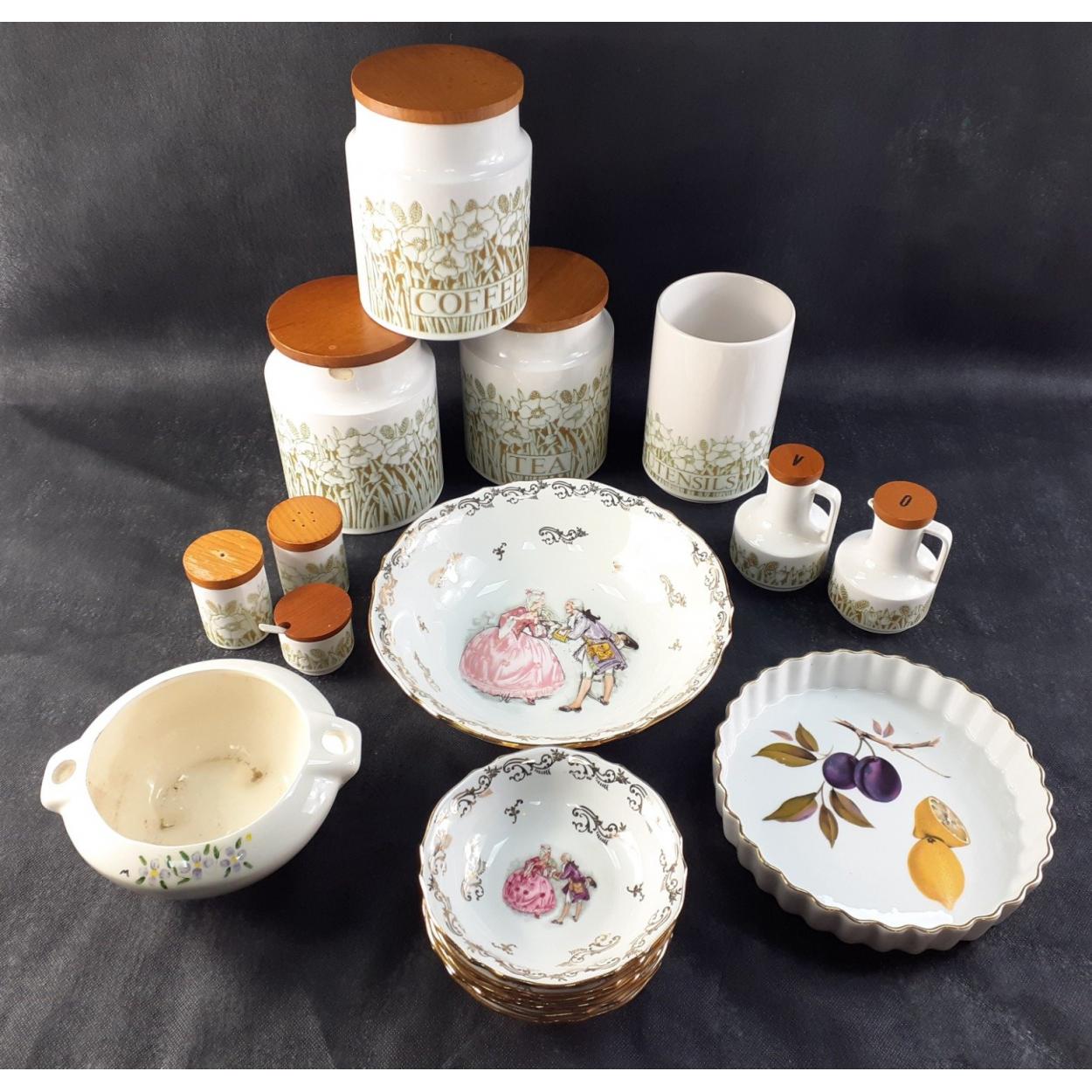 A collection of HORNSEA kitchenware to include tea and coffee jars, utensils, vinegar and oil, mustard pot and one storage jar with no label (small chip in rim), also includes other dishes with a Royal Worcester EVESHAM flan dish