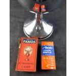 A rare find - a large FAMOS 120 candle power oil lamp in original box with shade and chimney all in excellent condition. With a spare Aladdin chimney in a box. Stands 60cm with chimney. Original supplier label of Jedburgh Co-op. Appears unused