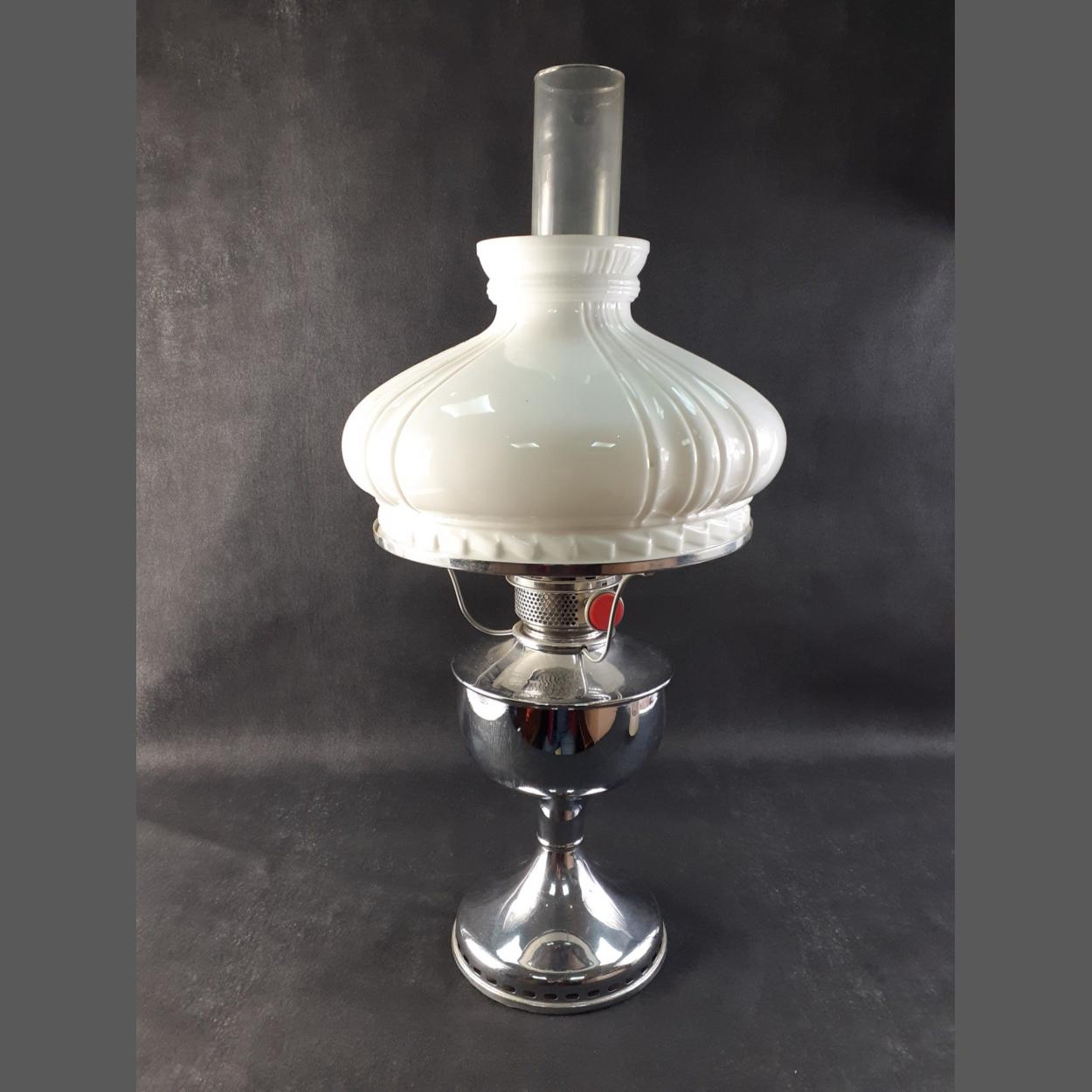 A rare find - a large FAMOS 120 candle power oil lamp in original box with shade and chimney all in excellent condition. With a spare Aladdin chimney in a box. Stands 60cm with chimney. Original supplier label of Jedburgh Co-op. Appears unused