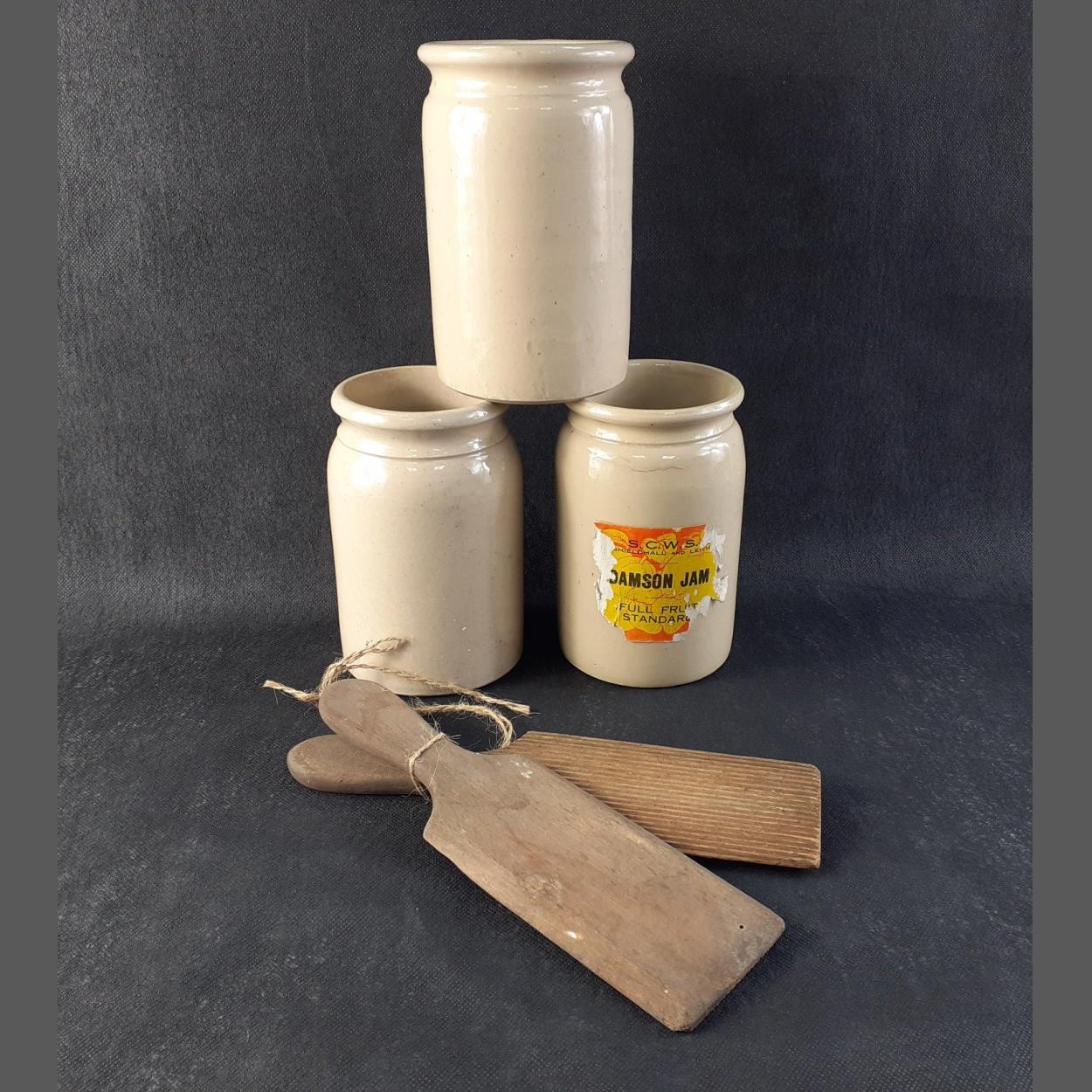 Three vintage BUCHAN WARE pots each 15cm high and a pair of butter pats