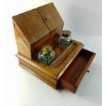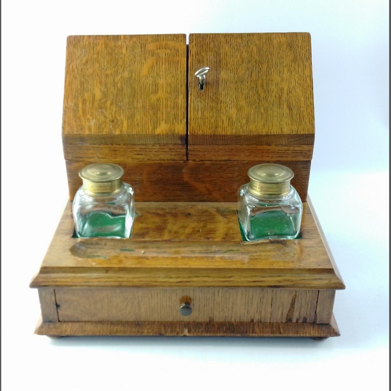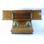 A rather nice Edwardian wooden stationery desk box with two matching glass ink bottles, drawer below, stationery rack with doors, with key 26Hx31Wx24cmD