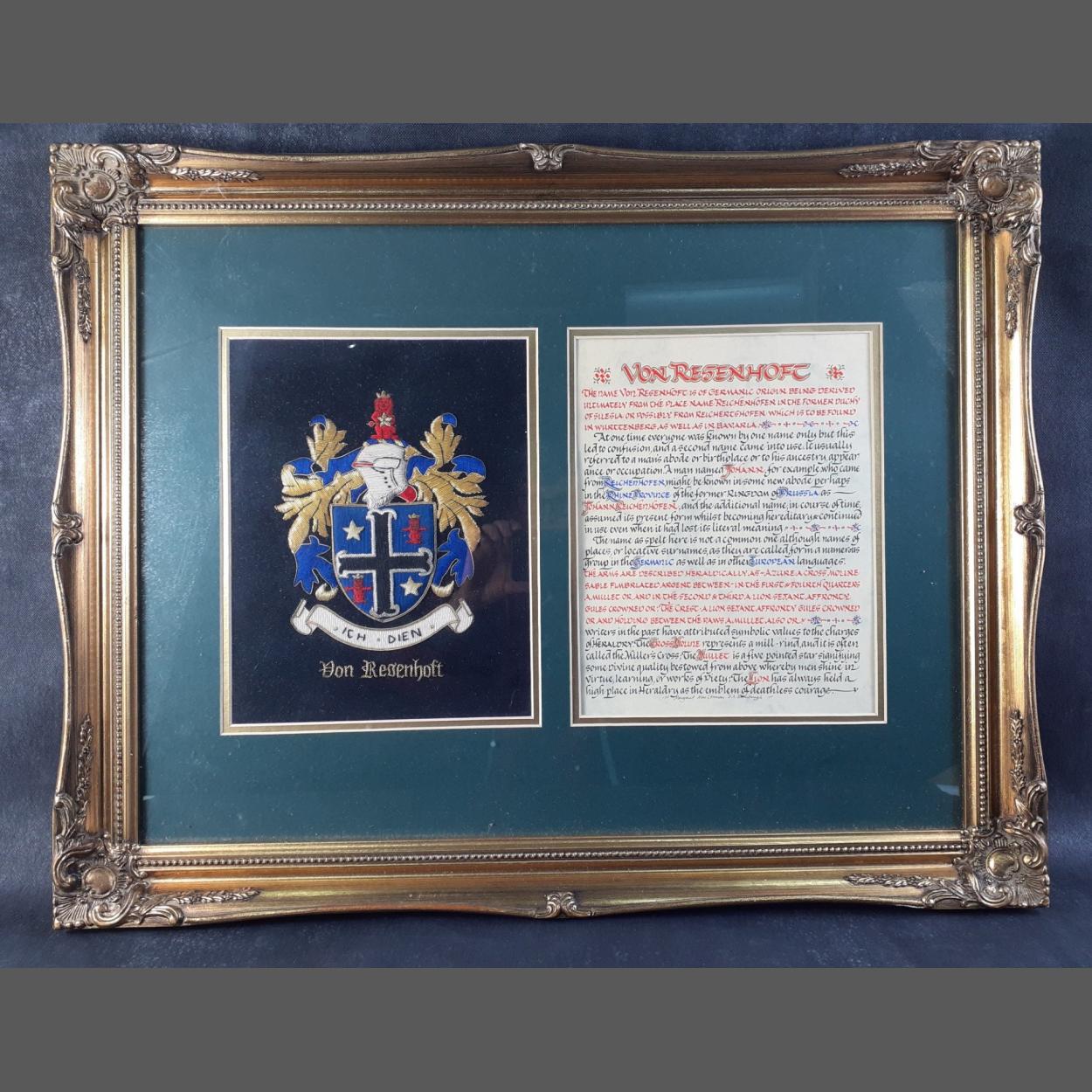 A large framed heraldic family crest, for the von RESENHOFT family, frame size 69x54cm