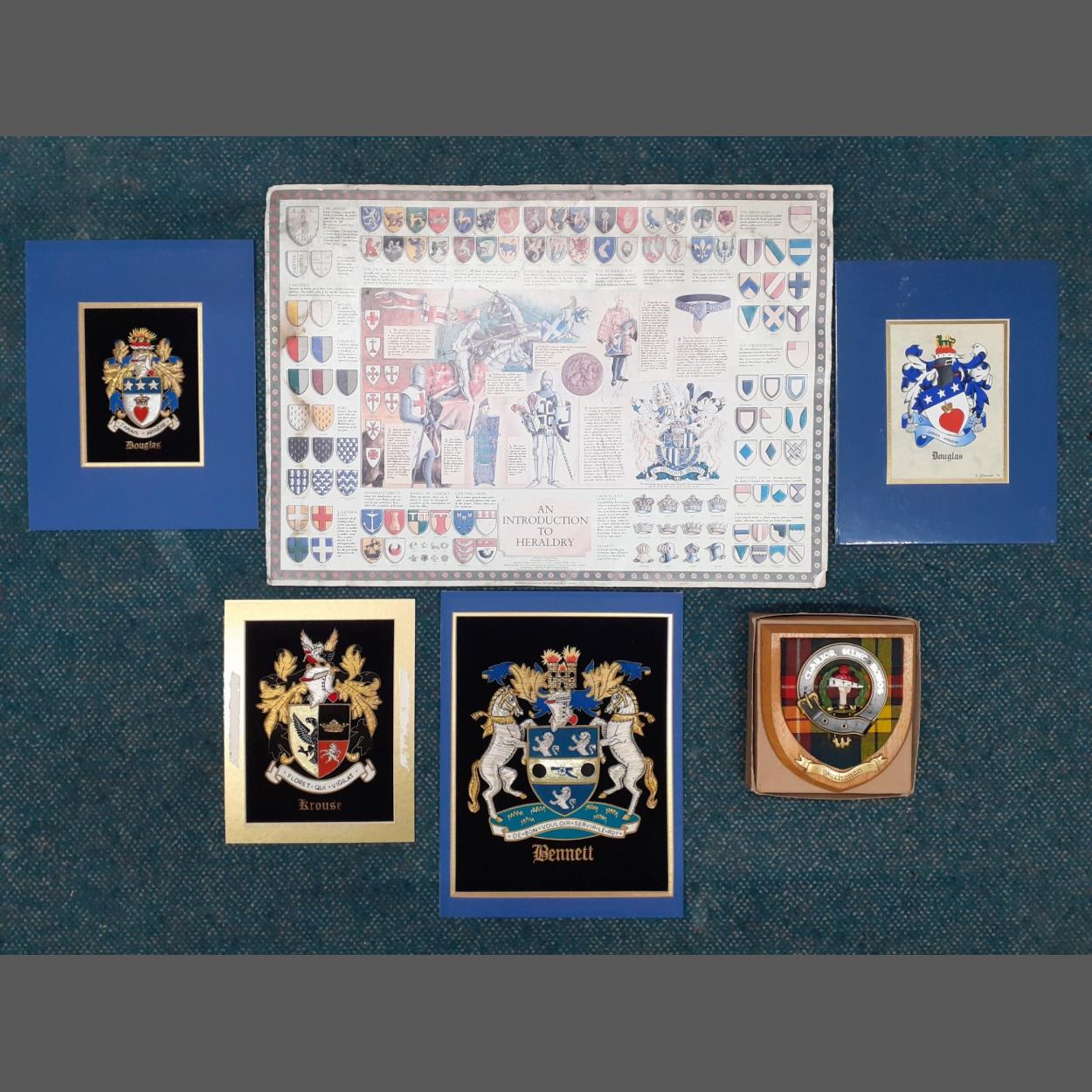 A collection of unframed family crests to include BENNETT, BUCHANAN, a DOUGLAS plaque, and a heraldic crest chart