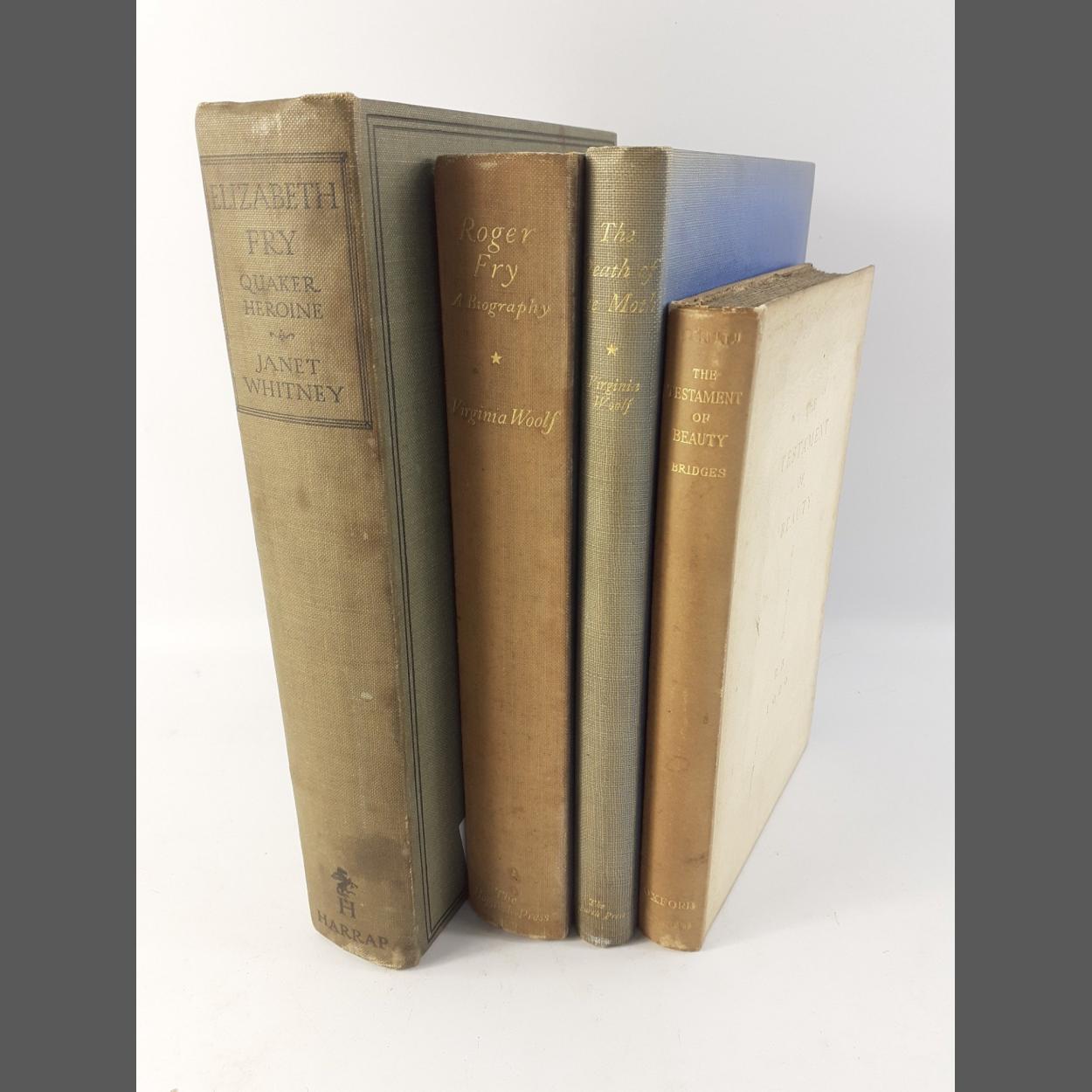 An interesting collection of early edition books including ROGER FRY: A Biography by VIRGINIA WOOLF (published by The Hogarth Press 2nd impression 1940), ELIZABETH FRY: Quaker Heroine by JANET WHITNEY (pub. George G Harrap, reprint May 1938), THE DEATH OF THE MOTH by VIRGINIA WOOLF (pub. The Hogarth Press, first edition 1942), THE TESTAMENT OF BEAUTY by ROBERT BRIDGES (pub. OUP ninth impression July 1930 with uncut pages). All books are hardback with some foxing but in good condition