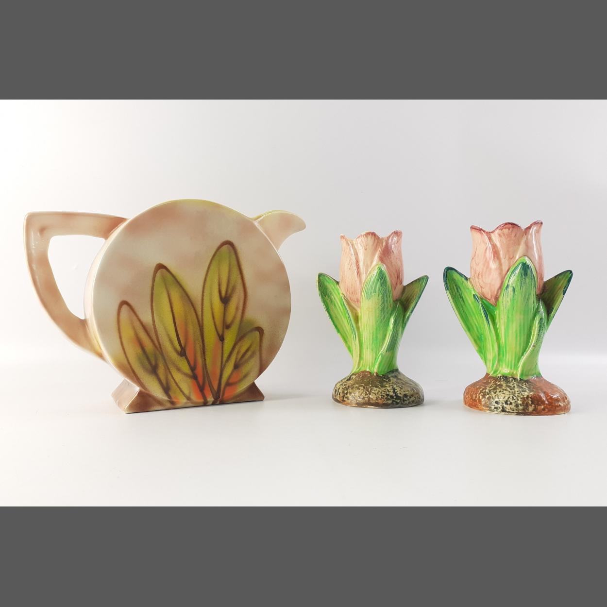 A ROYAL ART POTTERY jug and a pair of TULIP flower vases by SHORTER & SON