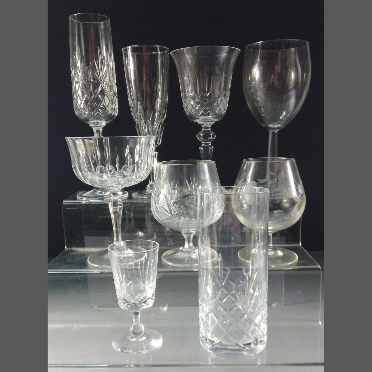 XMAS GLASSES FOR THE TABLE - four brandy glasses, 2 with BOHEMIA labels, 2 stamped FRANCE, 6 crystal champagne saucers, 2 hi-ball glasses, 8 large wine glasses, etc