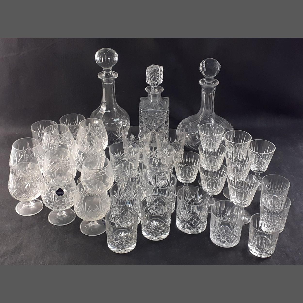 A mixed box of crystal glasses to include 3 EDINBURGH CRYSTAL (made in Czech Republic) brandy glasses, various whisky tumblers including some engraved EDINBURGH CRYSTAL INTERNATIONAL, sherry glasses with matching decanters