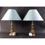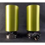 Two pairs of table lamps to include brass based with sky-blue shades approx 45cm tall, and also a pair of cylindrical chartreuse lamps 30cm tall