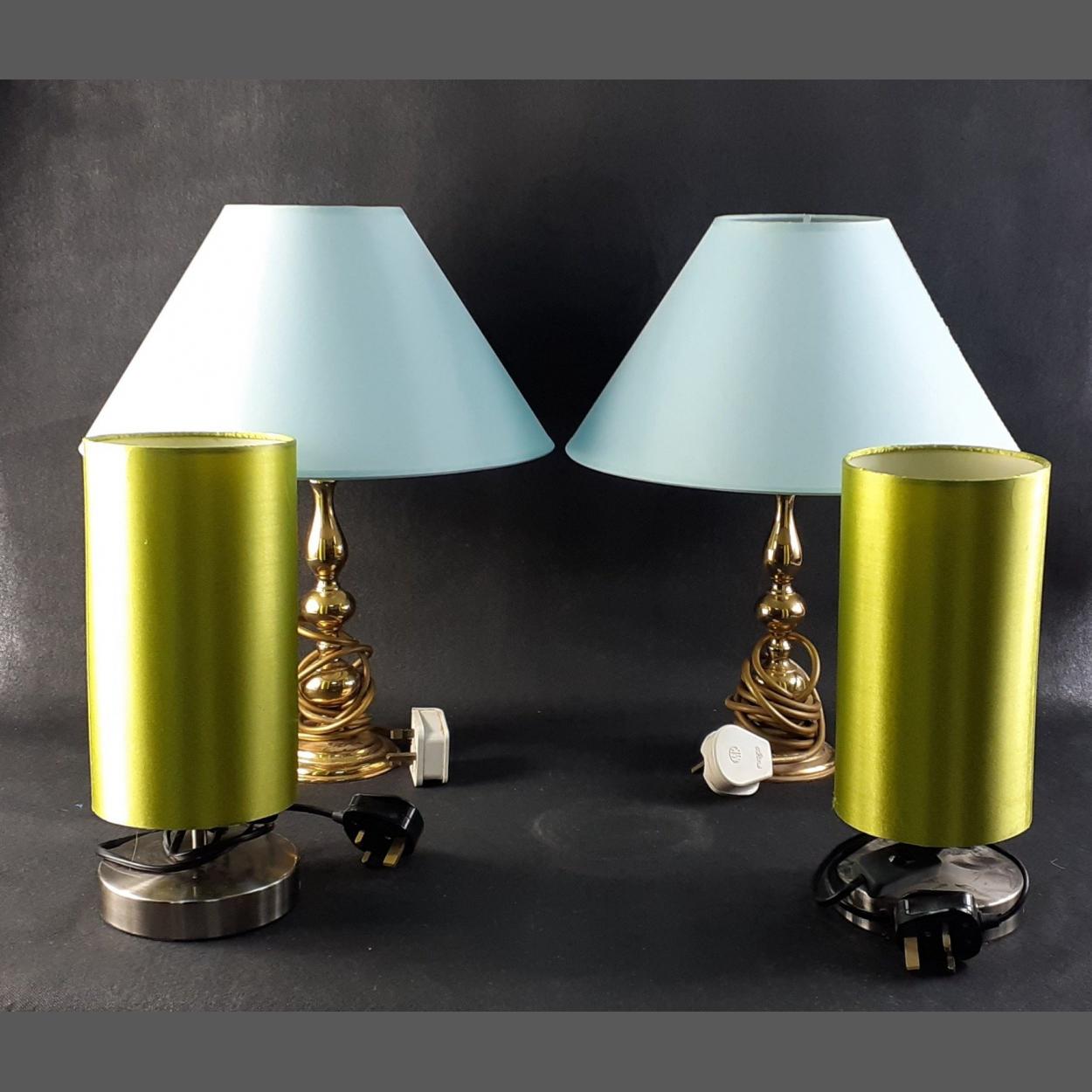 Two pairs of table lamps to include brass based with sky-blue shades approx 45cm tall, and also a pair of cylindrical chartreuse lamps 30cm tall