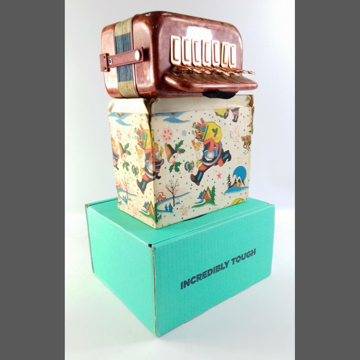 Vintage HERO ACCORDION made in Shanghai China. Toy accordion in lovely condition in box base without lid. Gorgeous colours and seems to play well.