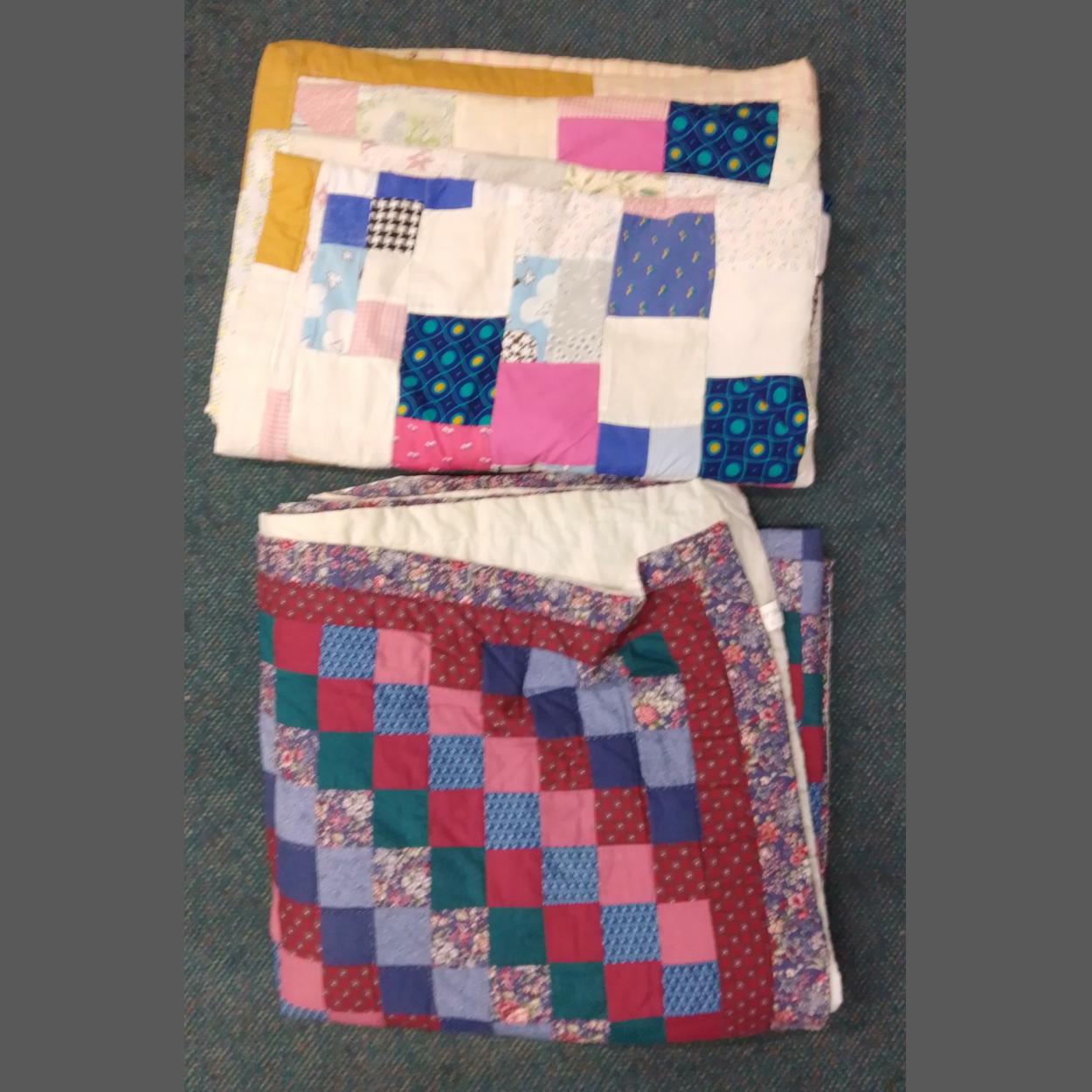 A cotton single bed size patchwork quilt in darker shades of blue and red and a cot size patchwork quilt in pinks and blues