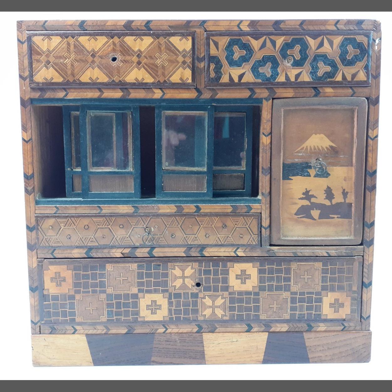 An interesting inlaid marquetry box in the Oriental style, missing handles 35Hx35Wx14cmD approx