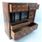 An interesting inlaid marquetry box in the Oriental style, missing handles 35Hx35Wx14cmD approx