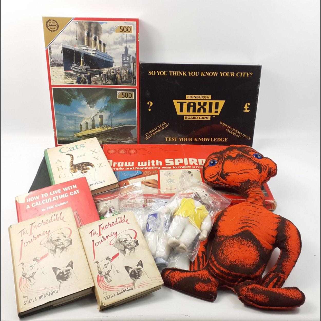 A mixed box to include boxed, sealed Edinburgh taxi board game, 2 x 500 piece Titanic jigsaw (sealed), an ET plush toy, Spirograph set, old cat books and 3 sealed plush cat novelty toys