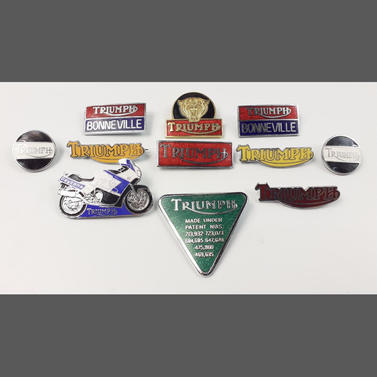 TRIUMPH MOTORCYCLE pin badges. New Old Stock NOS from the family of legendary Edinburgh Motor Bike Dealer EDDIE KOSKI of West Pier Motor Cycles in Brandon Terrace Edinburgh. Comprises eleven TRIUMPH badges all in good order