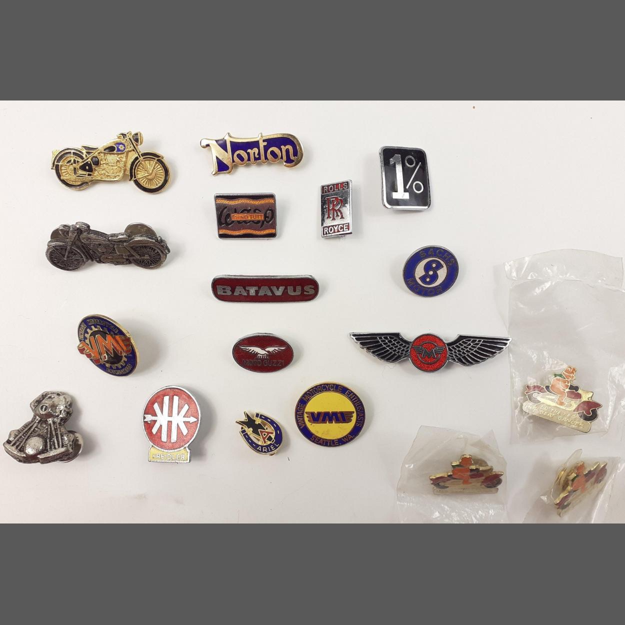 Assorted MOTORCYCLE pin badges. New Old Stock NOS from the family of legendary Edinburgh Motor Bike Dealer EDDIE KOSKI of West Pier Motor Cycles in Brandon Terrace Edinburgh. Comprises fifteen manufacturer badges all in good order and three Ed' The Ted charity pins the family produced as fund raisers for Cancer Charities in Eds memory.
