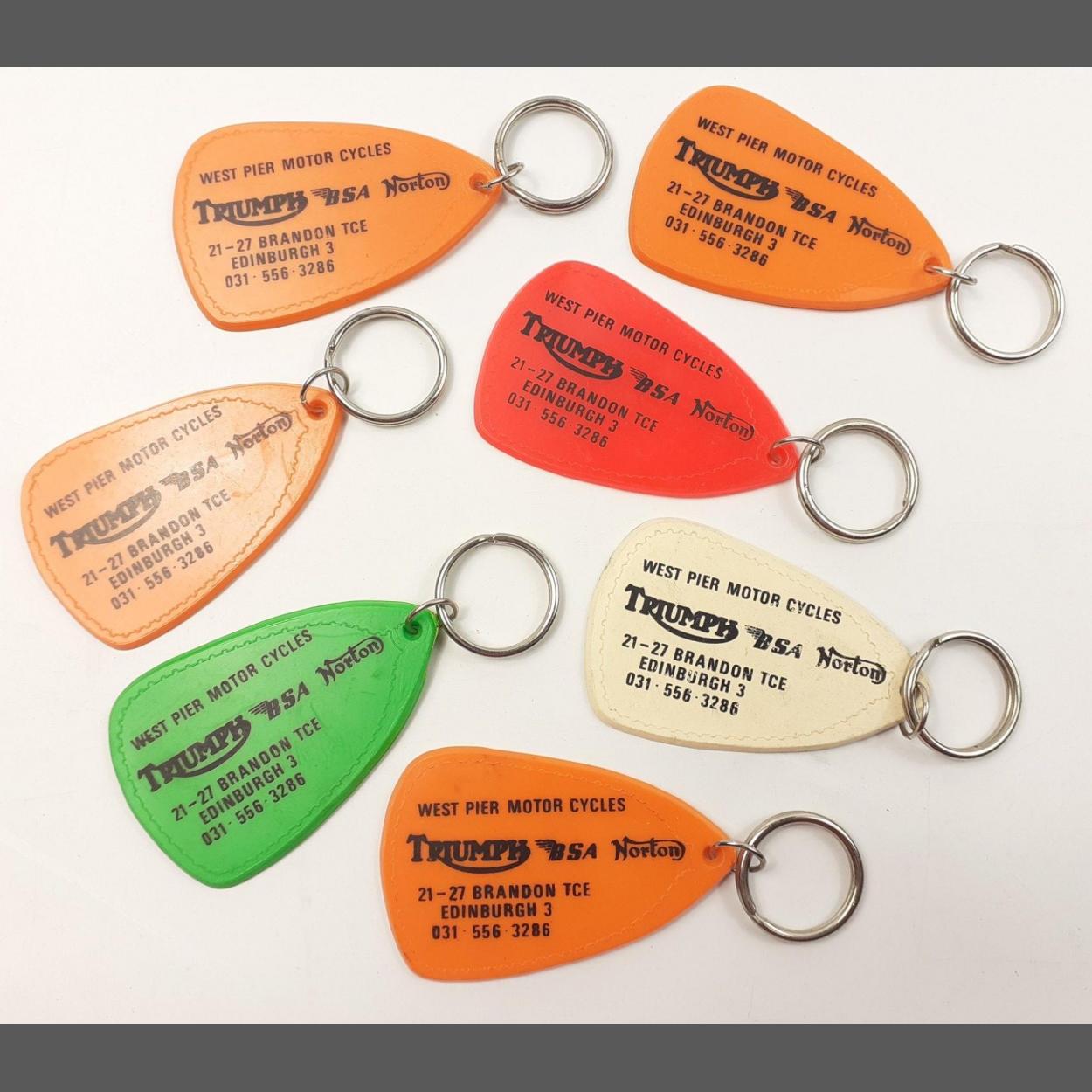 Vintage MOTORCYCLE Keyrings. New Old Stock NOS from the family of legendary Edinburgh Motor Bike Dealer EDDIE KOSKI of West Pier Motor Cycles in Brandon Terrace Edinburgh. Comprises seven TRIUMPH / BSA / NORTON marked keyrings all in good order