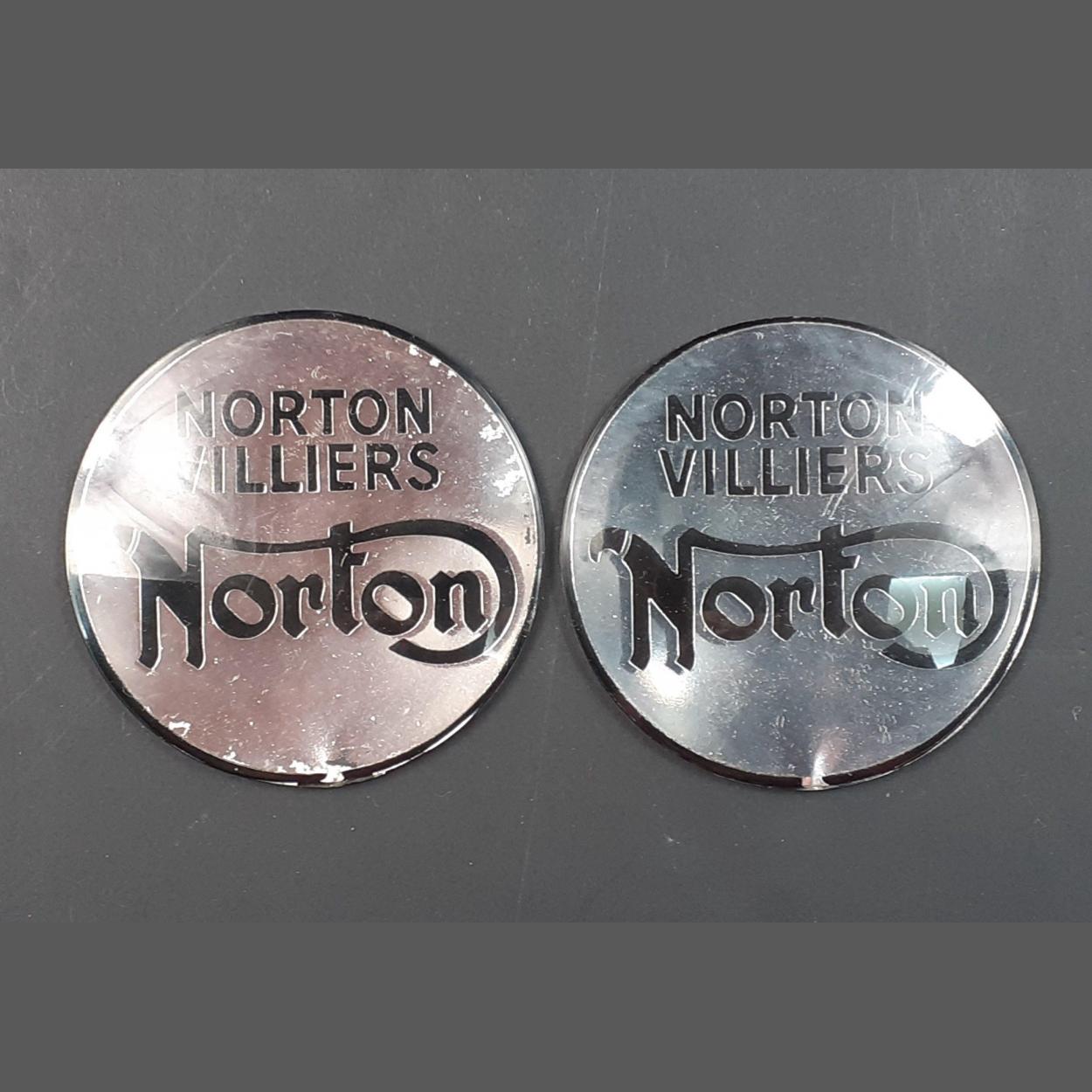 NORTON MOTORCYCLE tank badges. New Old Stock NOS from the family of legendary Edinburgh Motor Bike Dealer EDDIE KOSKI of West Pier Motor Cycles in Brandon Terrace Edinburgh. Comprises a pair of acrylic NORTON VILLIERS badges both in good order