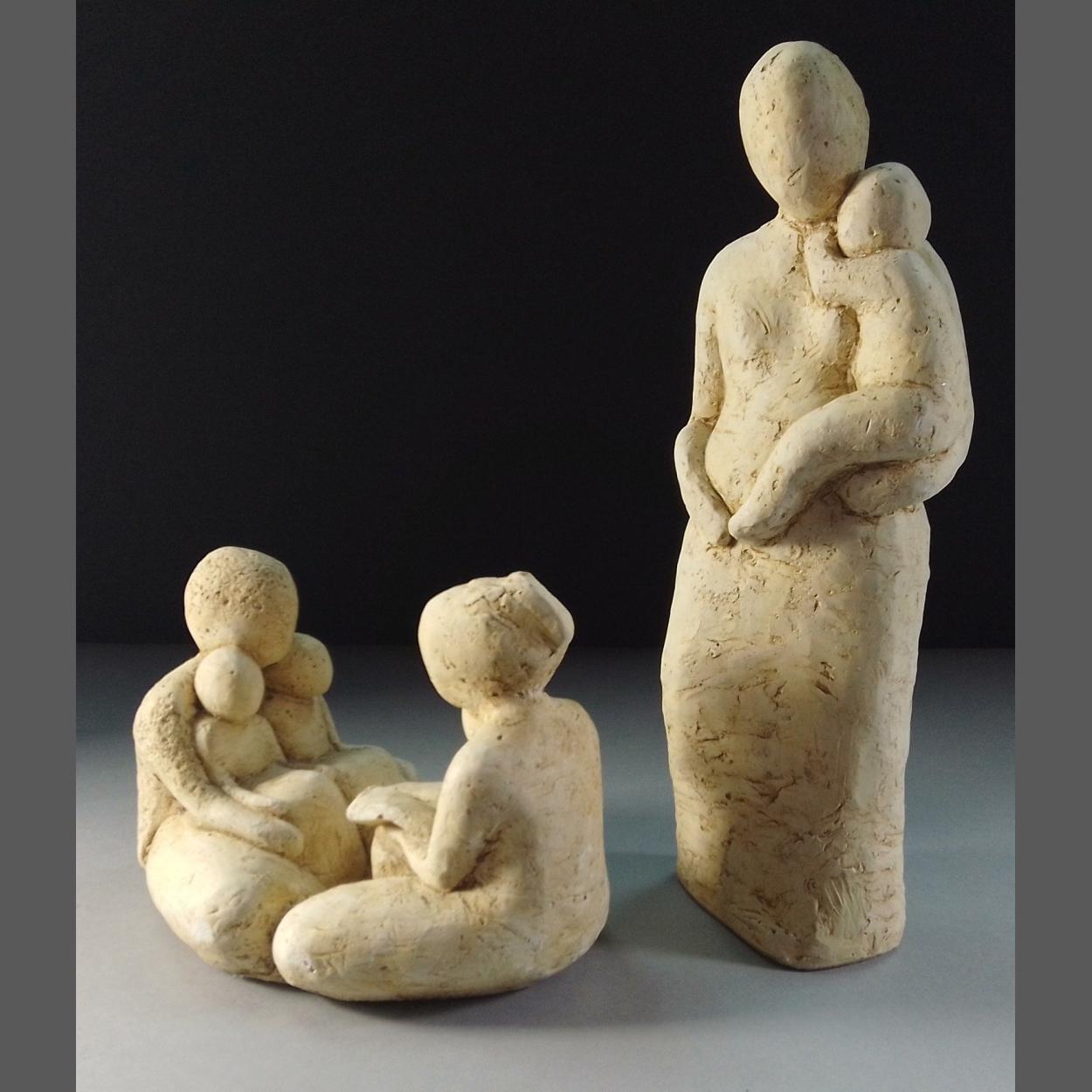 Two primitive clay effect figurines of family scenes, one of 2 adults reading to 3 children (20cm L x 16cm H approx), the other a woman holding a child in her arms (35cm high approx)