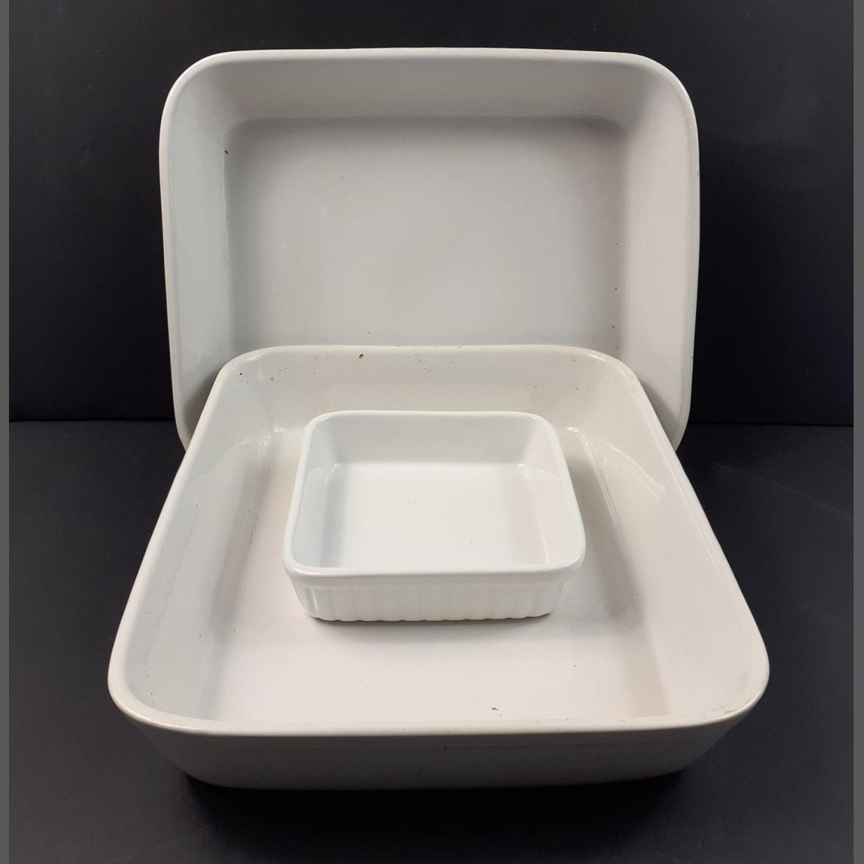 Two large RAYWARE white ceramic oven-proof dishes 34x28cm and a further un-named ceramic lasagne dish 16x16cm