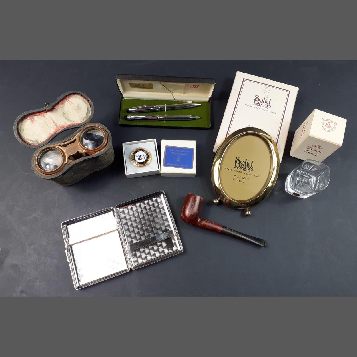A mixed lot to include a boxed CROSS ball pen and pencil set, a brass photo frame (9x13cm), a vintage set of cased binoculars, a pipe, and a machine turned cigarette case,