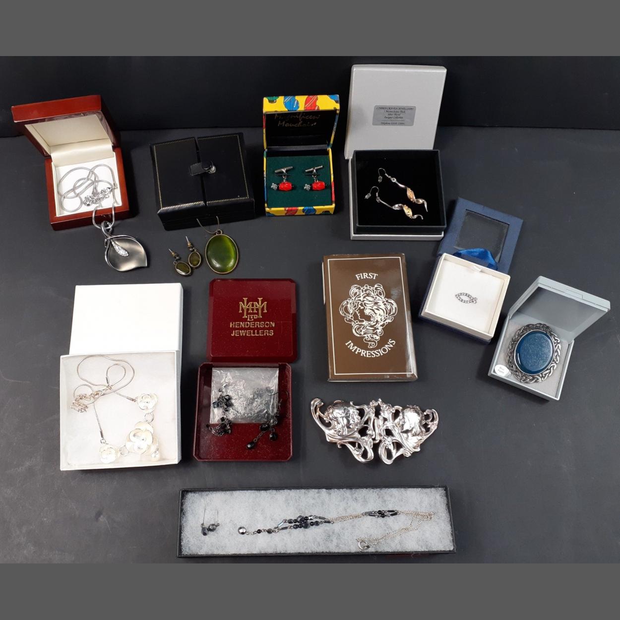 A selection of quality boxed costume jewellery to include necklaces, earrings, brooches, gold club cuff links, belt-buckle, etc