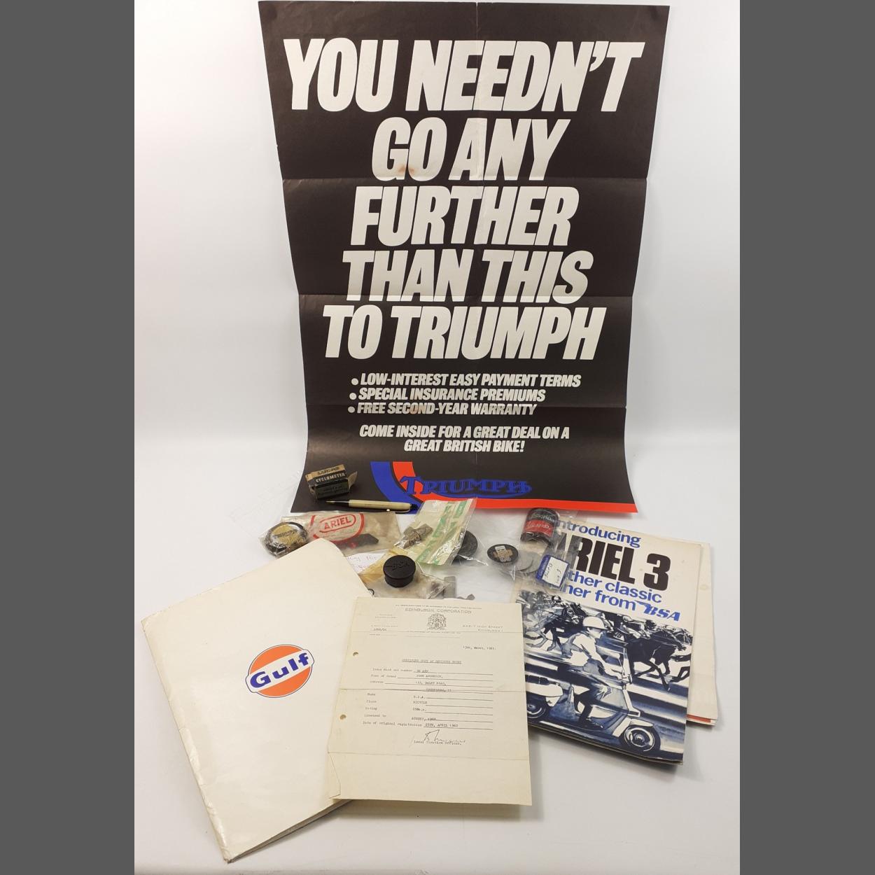 An interesting box of MOTORBIKE / MOTORCYCLE pieces and ephemera. DOUGLAS VESPA headbadge, TRIUMPH rubber caps, a Lucsa Cyclometer and other parts. Includes an older GULF folder with EDDIE KOSKI ephemera