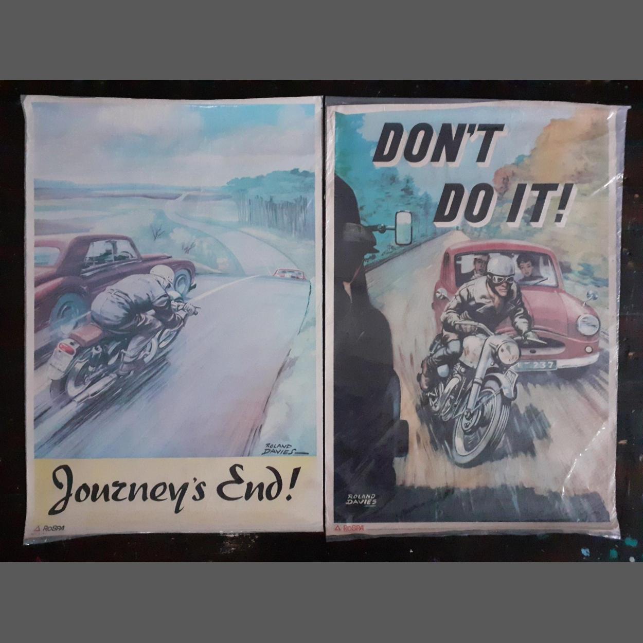 Two original ROLAND DAVIES ROSPA motorcycle safety posters, rolled in non-adhered plastic for storage. Some age related wear 75x50cm approx