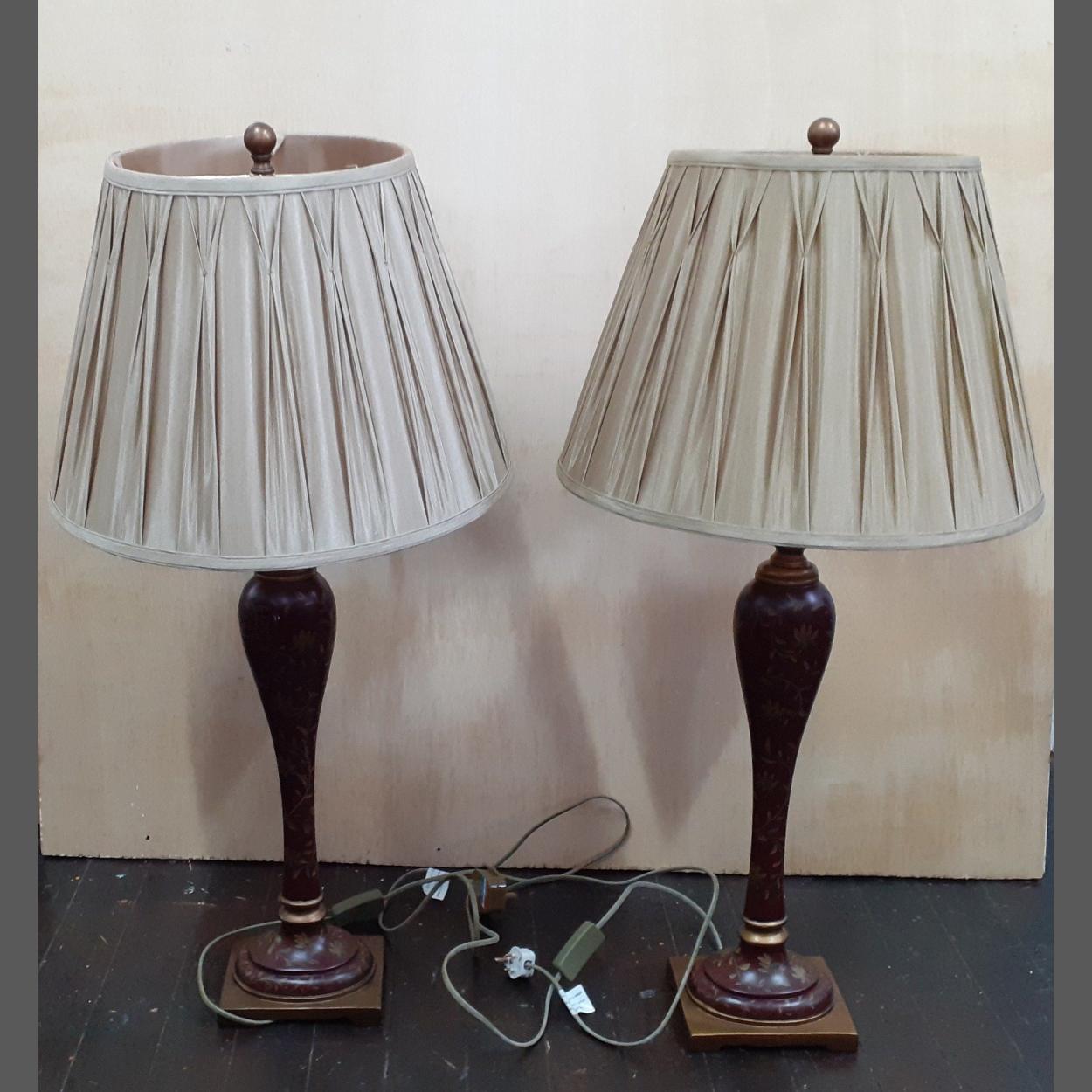 A pair of wooden floral based table lamps standing approx 80cm high. In nice condition with beige silk shades