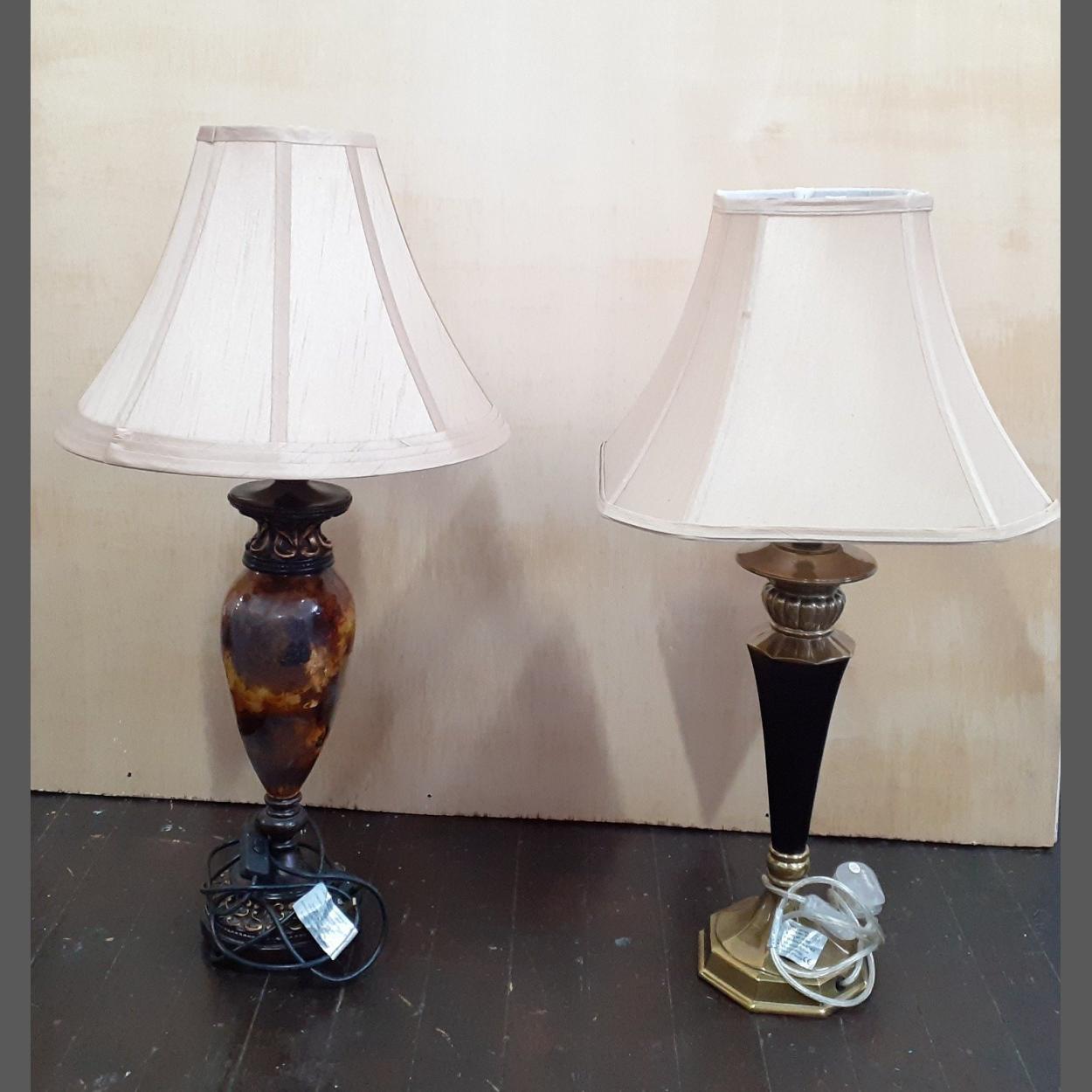 A rather attractive bulbous stone table lamp with silk shade with lovely iridescent finish approx 80cm high and 1 other with brass stand and tapered black body