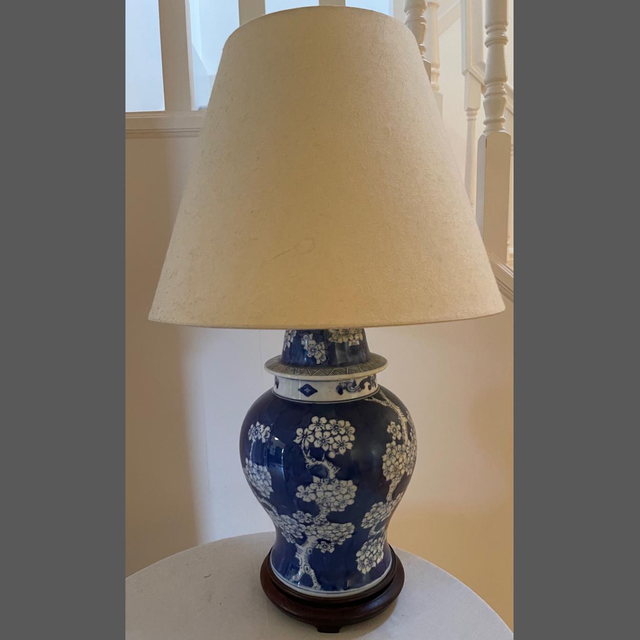 A QUALITY ORIENTAL style blue and white ceramic electric table lamp on a wooden plinth - height 48cm approx