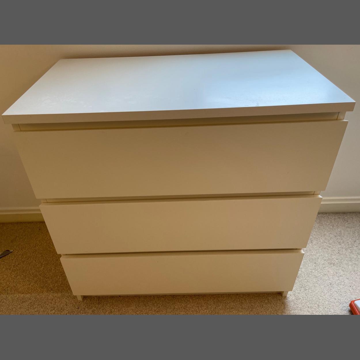 An ex-IKEA set of three drawer chest of drawers finished in white - dimensions 2.25ft height x 18" depth x width 3ft approx - in nice clean condition- part of a bedroom set of chest of drawers in subsequent lots