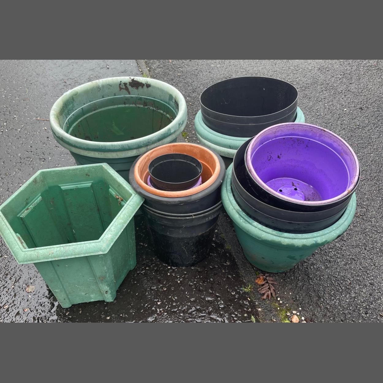 An ACCUMULATION of garden containers to include a nice lilac one!